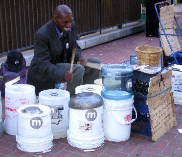 On emerging tonight from the subterranean world of the Muni, a pounding beat caught my ear. At first I thought it was the annoying cacaphony of the hotel picketers, but then I realized it was a good rhythm! Another musician gracing the passersby.