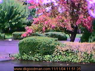 The view from a webcam looking out a front window of my house after the rain, with the colors of fall (yes, even here in Northern California) and the distortion of the window glass.