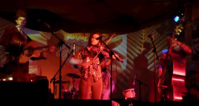 The band last night consisted of David Tiller on guitar and mandolin, Enion Pelta-Tiller on violin, William Downes on bass, and percussionist-extraordinaire Dale Largent on djembe, doumbek, cymbals and you-name-it. They describe themselves as "Seismic gypsy hypno grazz", whatever that means. They reminded me of Jean-Luc Ponty, Barrage, Dan Hicks & His Hot Licks, Bela Fleck, and Willie and Lobo, all scrambled up in a barrel. Their sound is fast, fluid, bluesy, exotic and a little bit country. They're all I could ask for in a band, although a little harmonica, horns or sax wouldn't hurt.