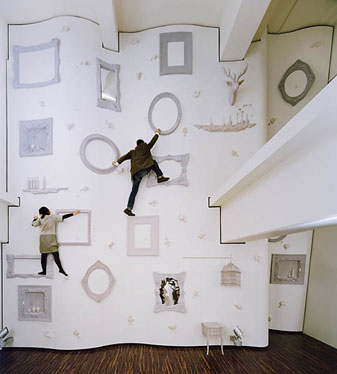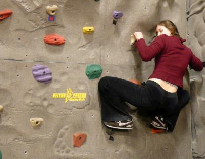 We all went to the gym today. While Connie was doing her regular routine on the exercise equipment, Debbie and I played air hockey and practiced martial arts moves. Oh yeah... and we went up the climbing walls. Great fun. That's her above. Below is a photo of a crazy Japanese climbing wall. Check out the story at SCI FI Tech.