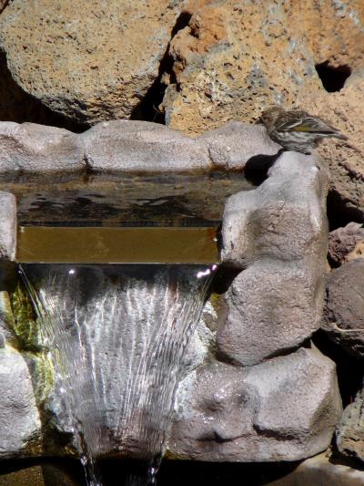 So I stuck the end of the pump tubing into the garden hose and turned the water on full blast, flushing out the tubing. Joy. Why is it that we always find things in the last place we look? That restored the water flow to what you see pictured here, and the water level has been stable. I am pleased. So are the birds that like to drink from the pond.